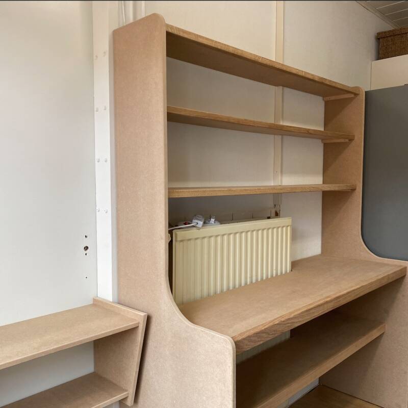 Het gebruikte plaatmateriaal is watervast mdf, het latwerk is van eikenhout. De klant heeft de buffetkast voorzien van een aantal lagen blanke lak. Alles bij elkaar is er hier een mooie verbetering gerealiseerd. Een nieuwe opbergruimte die meer rust en gezelligheid geeft in deze keuken.